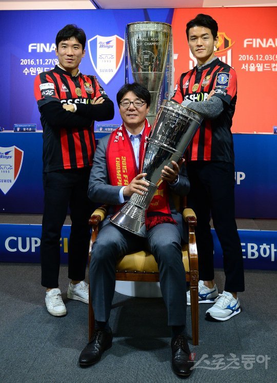 24일 서울 종로구 신문로 축구회관에서 ‘2016 KEB하나은행 FA컵’ 결승전을 앞두고 미디어데이가 열렸다. FC서울 고요한, 황선홍 감독, 주세종(왼쪽부터)이 포즈를 취하고 있다.