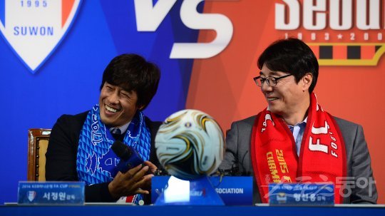 24일 서울 종로구 신문로 축구회관에서 ‘2016 KEB하나은행 FA컵’ 결승전을 앞두고 미디어데이가 열렸다. 수원삼성 서정원 감독과 FC서울 황선홍 감독(오른쪽)이 기자회견 중 환하게 웃고 있다.
