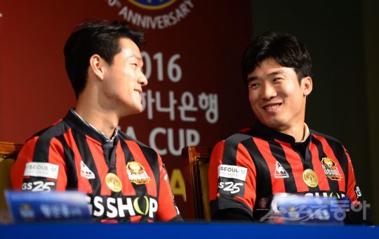 24일 서울 종로구 신문로 축구회관에서 ‘2016 KEB하나은행 FA컵’ 결승전을 앞두고 미디어데이가 열렸다. FC서울 고요한이 주세종(왼쪽)과 웃으며 대화를 나누고 있다.