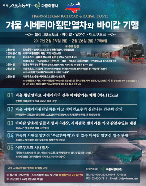 10여년전부터 시베리아 여행상품을 취급한 전문여행사 마중여행의 김창원 대표는 “바이칼 호수와 알혼섬 일대는 주변에 공장지대가 없어 청정자연의 진수를 만날 수 있는 곳”이라며 “특히 2월에는 일조량이 가장 좋아 믿기 힘들 정도로 깊은 수심까지 투명하게 비치는 호수 위에서 바라보는 시원스런 풍경이 절경이다”고 소개했다.