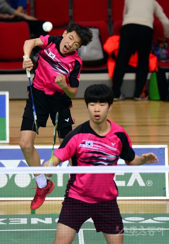 2016 요넥스 코리아주니어오픈 국제배드민턴선수권대회가 21~27일 경남 밀양배드민턴경기장에서 열린다. 25일 U-15 남자 복식 8강전에서 한국 이학주(위)-이상협 조가 스매싱 공격을 하고 있다.