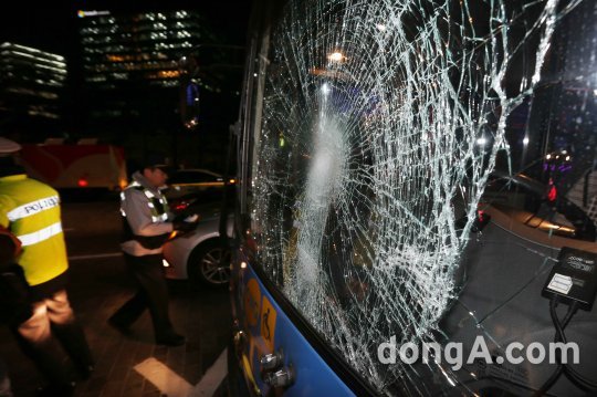25일 오후 서울 광화문 광장에서 열린 대학생 총궐기 문화제에서 한 방송사 기자가 취재를 하던 중 버스와 충돌하는 사고가 발생했다. 사진은 교통사고 후 깨진 버스 유리창.