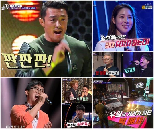불꽃 튀는 두뇌 싸움과 매번 뒤통수 치는 대 반전의 노래 대결로 화제를 모으는 KBS 2TV ‘노래싸움-승부’(연출 손수희, 이하 '승부') 25일 방송은 노래의 힘을 깨닫게 했다. '승부'는 연예인들이 뮤지션 감독의 지휘 아래 1:1 대결로 한 노래를 부르며 승부를 가린다. 이날은 김광진, 박수홍, 김형석, 조규찬이 음악감독을 맡고, 이진호, 고명환, 추성훈, 문천식, 조세호, 박나래, 이용진, 남창희, 신수지 등이 출연해 노래대결을 펼쳤다. .