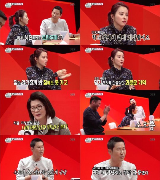 이번 주 SBS’미운우리새끼’의 최고의 1분은 한혜진이었다. 허지웅이 물공포증을 극복하기 위해 수영장을 찾은 모습을 본 뒤, 어머님들과 ‘트라우마’에 대해서 토크를 이어갔다. 그러다 한혜진은 어릴 적 학교 앞에서 기다렸던 ‘아저씨 트라우마’에 대해 이야기 했다. 고등학교를 하교할 때 모르는 아저씨가 따라다녀 집에도 바로가지 못하고 다른 곳에 들렀다 집으로 향했다며 그 때‘아재 트라우마’가 생긴 것 같다고 말했다.