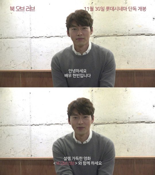 현빈은 SBS 드라마 [시크릿 가든], 영화 ‘역린’ 등으로 조각 같은 외모뿐만 아니라 탄탄한 연기력까지 인정받은 배우로 영화 ‘공조’ ‘꾼’의 개봉을 앞두고 있다. 이번에 공개된 영상 속 현빈은 ‘만추’에서 함께 호흡했던 탕웨이가 ‘북 오브 러브’에서 보여줄 매력에 대한 기대감을 밝히며 아직 식지 않은 애정을 드러냈다. 더불어 “요즘 같이 쌀쌀한 날씨에 여러분의 가슴을 따뜻하게 해줄 것 같다”라며 든든한 지원군 역할을 톡톡히 했다. 또한 영화 ‘북 오브 러브’에 대해 “올 겨울, 사랑을 하고 계신 분들, 사랑을 기다리시는 분들을 위한 설렘 가득한 영화”라고 표현하며 가슴 두근거리는 연애로망을 자극하는 로맨스 영화로 ‘북 오브 러브’를 강력 추천했다.