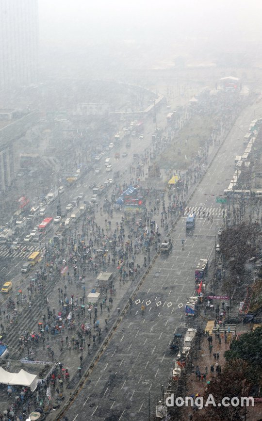 26일 오후 서울 광화문 광장에서 열리는 박근혜 정부 퇴진을 요구하는 5차 촛불집회 예정된 가운데 첫눈리 내리고 있다.