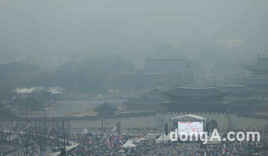 26일 오후 서울 광화문 광장에서 열리는 박근혜 정부 퇴진을 요구하는 5차 촛불집회 예정된 가운데 광화문 뒤로 청와대가 안개 속에 쌓여 있다.