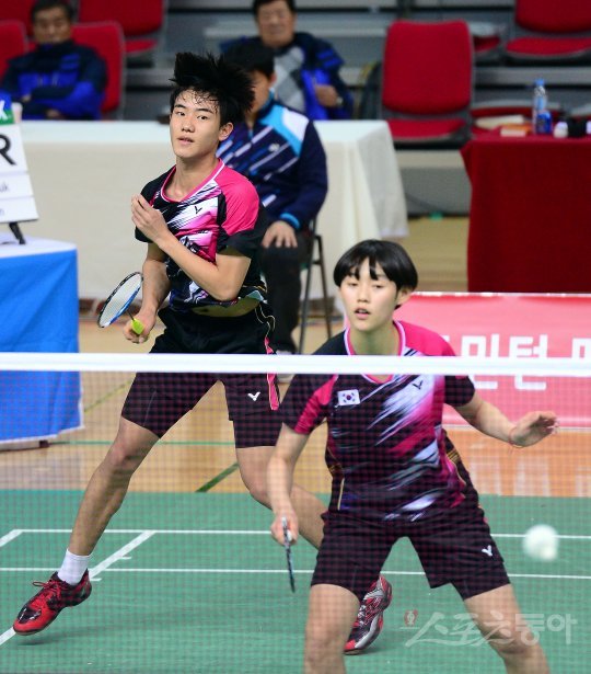 2016 요넥스 코리아주니어오픈 국제배드민턴선수권대회가 21~27일 경남 밀양배드민턴경기장에서 열린다. 26일 U-19 혼합 복식 4강전에서 한국 강민혁(위)-심유진 조가 스매싱 공격을 하고 있다.