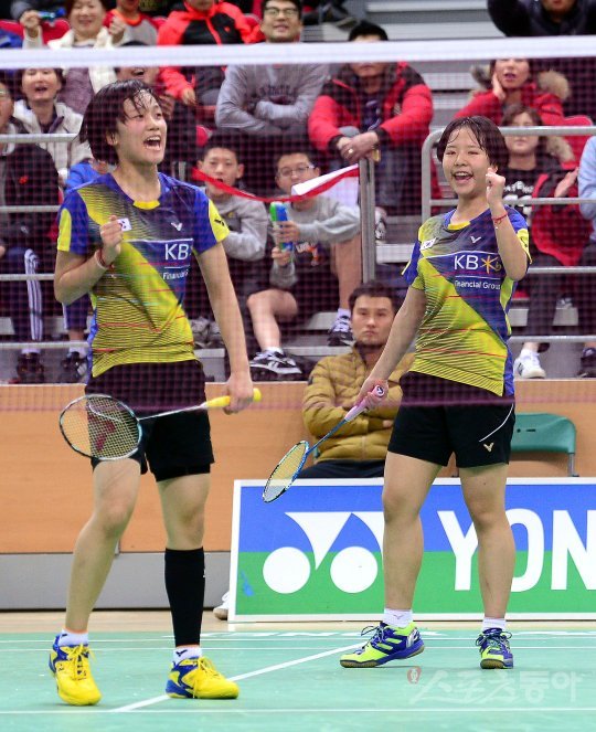 2016 요넥스 코리아주니어오픈 국제배드민턴선수권대회가 21~27일 경남 밀양배드민턴경기장에서 열린다. 26일 U-17 여자 복식 4강전에서 한국 박가은(위)-김성민 조가 세트스코어 3-1 승리를 거둔 후 환호하고 있다.