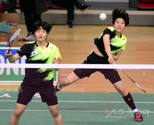 2016 요넥스 코리아주니어오픈 국제배드민턴선수권대회가 21~27일 경남 밀양배드민턴경기장에서 열린다. 26일 U-17 여자 복식 4강전에서 한국 안채현(오른쪽)-이유림 조가 스매싱 공격을 하고 있다.