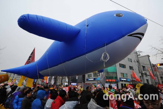 26일 서울 광화문광장 일대에서 열린 '최순실 게이트' 진상규명과 박근혜 대통령 퇴진을 촉구하는 5차 촛불집회에서 시민들이 세월호 참사 상징 대형 고래 충선도 풍선을 들고 있다.