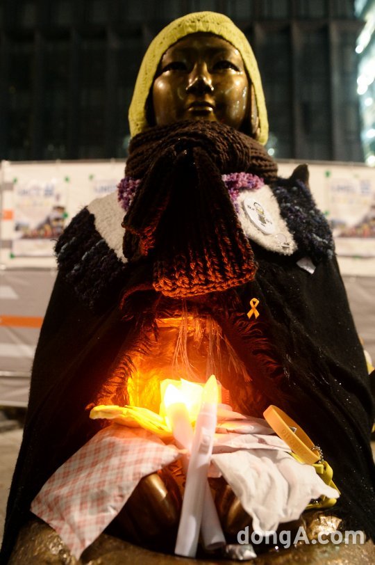 '최순실 게이트' 진상규명과 박근혜 대통령 퇴진을 촉구하는 5차 촛불집회가 열린 26일 오후 서울 종로구 일본대사관 앞 소녀상에 촛불이 놓여 있다.