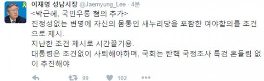 이재명 성남시장은 29일 트위터 계정을 통해 “박근혜 대통령, 국민우롱 혐의 추가”라며 “진정성없는 변명에 자신의 몸통인 새누리당을 포함한 여야합의를 조건으로 제시. 지난한 조건 제시로 시간끌기용. 대통령은 조건없이 사퇴해야하며, 국회는 탄핵 국정조사 특검 흔들림 없이 추진해야”라고 적었다.