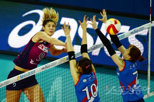 29일 인천 계양체육관에서 ‘2016-2017 NH농협 V리그’ 인천 흥국생명과 김천 도로공사의 경기가 열렸다. 흥국생명 러브가 도로공사 블로커를 피해 스파이크를 날리고 있다.