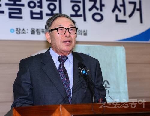 30일 서울 송파구 올림픽파크텔에서 통합 대한야구소프트볼협회 회장을 뽑는 선거가 열렸다. 김응용 후보가 총 투표수 127표 85표를 얻으며 4년 임기의 대한야구소프트볼협회 회장에 당선됐다. 김응용 후보가 당선 소감을 밝히고 있다. 송파 | 김진환 기자 kwangshin00@donga.com