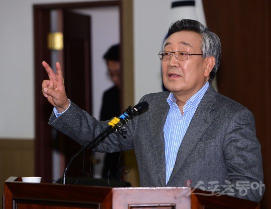 30일 서울 송파구 올림픽파크텔에서 통합 대한야구소프트볼협회 회장을 뽑는 선거가 열렸다. 기호 1번 이계안 후보가 정견 발표를 하고 있다.
