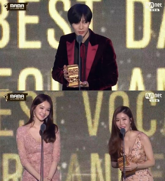 태민은 베스트댄스퍼포먼스 솔로 부문을 수상했다. 그는 "큰 상 감사하다. 쟁쟁한 후보들 사이에서 받게 돼 영광이다"라며 "더 노력하겠다"고 소감을 전했다.