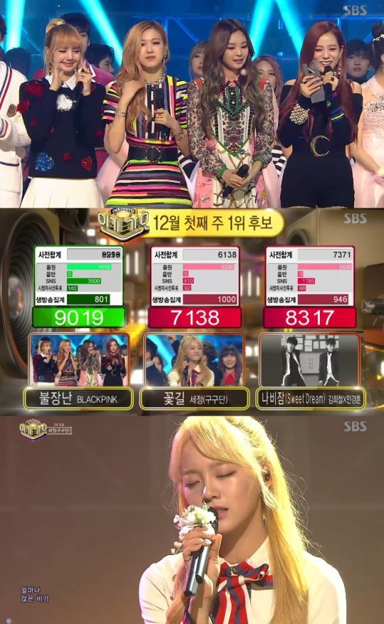 4일 '인기가요'에선 블랙핑크, 구구단 세정, 김희철X민경훈이 1위 경합을 벌였다. 김희철X민경훈 '나비잠'을 제외하고 생방송 무대에 오른 블랙핑크와 구구단 세정은 각각 '불장난'과 '꽃길'로 상반된 매력을 보여줬다.