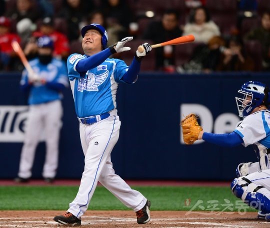 4일 서울 고척스카이돔에서 ‘레전드야구존과 함께하는 2016 희망더하기 자선야구대회’가 열렸다. 종범신팀 박재홍 해설위원이 헛스윙 삼진 아웃을 당하고 있다.