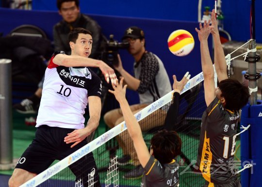 4일 천안 유관순체육관에서 ‘2016-2017 NH농협 V리그’ 천안 현대캐피탈과 구미 KB손해보험의 경기가 열렸다. 현대캐피탈 톤이 KB손해보험 블로커를 피해 스파이크를 날리고 있다.