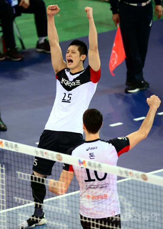 현대캐피탈 문성민이 가로막기를 성공시킨 뒤 포효하고 있다.