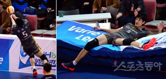 KB손해보험 김요한이 디그를 성공시킨 뒤 광고현수막과 충돌하고 있다.