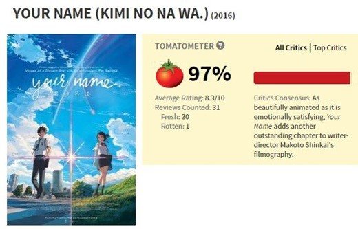 일본에 이어 중국, 홍콩, 태국, 대만까지 아시아 5개국 정상을 차지한 영화 '너의 이름은.'이 아시아를 넘어 미국, 유럽의 유력 매체로부터 뜨거운 호평을 받고 있다. '너의 이름은.'은 미국의 영화 정보사이트 로튼 토마토의 신선도 지수 97%를 기록하고 있으며, 이는 큰 기대감 속에 12월 7일 개봉하는 영화 '라라랜드'(96%)와 비슷한 수치다.
