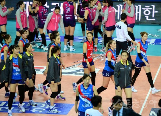 7일 인천 계양체육관에서 ‘2016-2017 NH농협 V리그’ 인천 흥국생명과 김천 도로공사의 경기가 열렸다. 도로공사가 흥국생명에 세트스코어 1-3으로 패하며 9연패에 빠지자 선수들이 코트를 빠져나가고 있다.