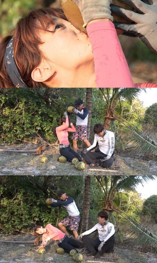 이번 주 방송되는 ‘정글의 법칙 in 동티모르’ 편에서는 유인영이 강남, 김환과 함께 코코넛 손질에 도전한다. 그런데 김환이 들고 있던 톱으로 코코넛을 자르던 중 코코넛 워터가 터져버린 것.