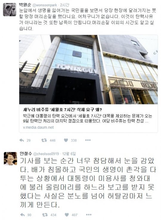 안 전 대표 역시 지난 6일 “기사를 보는 순간 너무 참담해서 눈을 감았다”며 “배가 침몰하고 국민의 생명이 촌각을 다투는 상황에서 대통령이 미용사를 청와대에 불러 올림머리를 하느라 보고를 받지 못했다는 사실은 분노를 넘어 허탈감마저 느끼게 만든다”고 밝혔다.