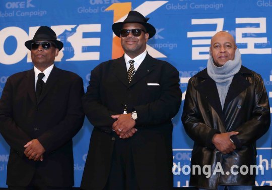 미국 팝가수 테리 루이스. 지미 잼, 피보 브라이슨(왼쪽부터)이 8일 오전 서울 마포구 상암 YTN 미디어홀에서 열린 'One K 글로벌 캠페인송' 제작발표회에 참석해 포토타임을 하고 있다.