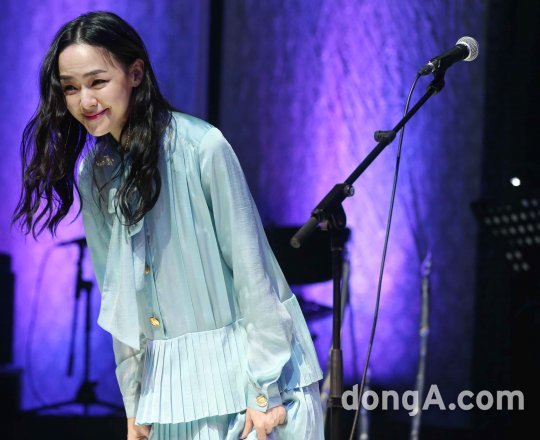 가수 김윤아가 8일 오후 서울 마포구 신한카드 판 스퀘어 라이브홀에서 열린 4집 앨범 '타인의 고통' 발매 쇼케이스에서 인사를 하고 있다.
