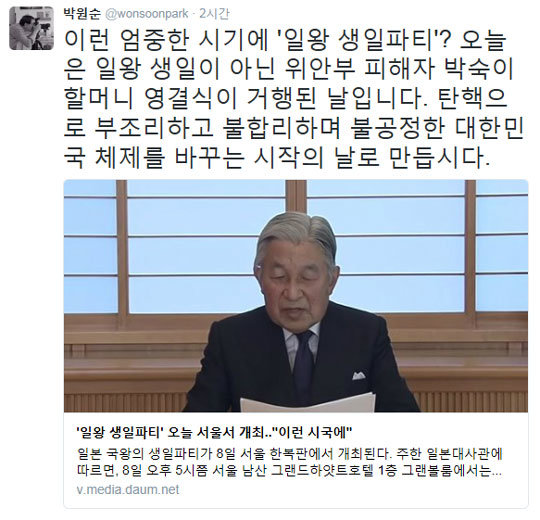 사진|일왕 생일파티 논란. 박원순 트위터 캡처
