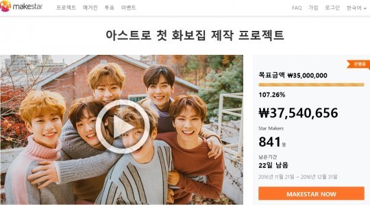 글로벌 크라우드펀딩 플랫폼 메이크스타에서 진행하고 있는 아스트로의 화보집 제작 프로젝트가 전세계 팬들의 참여로 목표금액을 100% 달성 소식을 전했다.