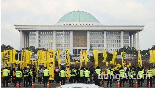 박근혜 대통령 탄핵소추안 표결일인 9일 오전 서울 여의도 국회의사당 앞에 단체들로 북적이고 있다.