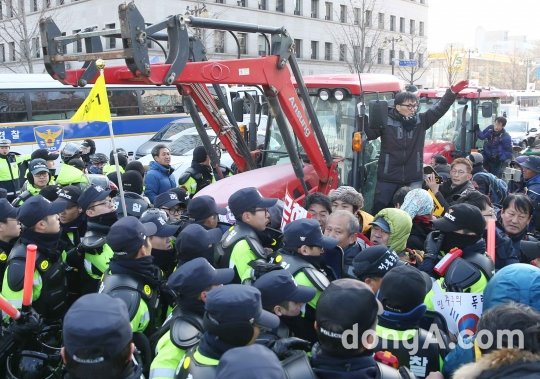 박근혜 대통령 탄핵소추안 표결일인 9일 오후 서울 여의도 국회의사당 앞에서 상경한 전봉준투쟁단의 트랙터가 등장하고 있다.
