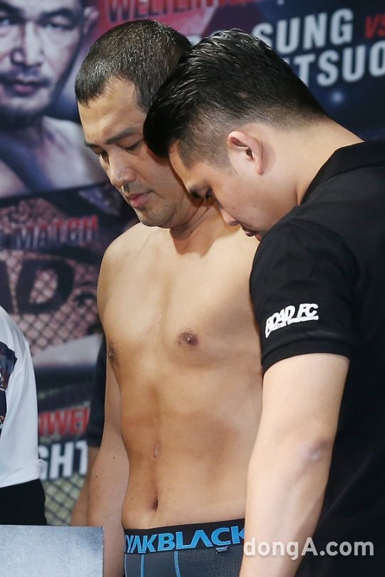 파이터 김보성이 9일 오후 서울 서초구 더케이호텔 컨벤션센터에서 열린 'XIAOMI ROAD FC 035' 계체량에서 포즈를 취하고 있다.