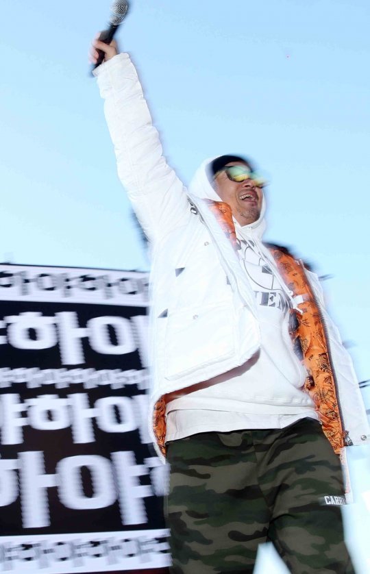 DJ DOC의 이하늘이 10일 오후 서울광장에서 열린 제7차 촛불집회 사전 행사에 참석해 무대를 선보이고 있다.