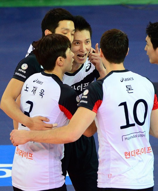 11일 천안 유관순체육관에서 ‘2016-2017 NH농협 V리그’ 현대캐피탈과 OK저축은행의 경기가 열렸다. 1세트 현대캐피탈 문성민이 득점에 성공 후 톤과 기쁨을 나누고 있다.
