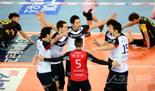 11일 천안 유관순체육관에서 ‘2016-2017 NH농협 V리그’ 현대캐피탈과 OK저축은행의 경기가 열렸다. 1세트 현대캐피탈 선수들이 득점에 성공 후 기쁨을 나누고 있다.