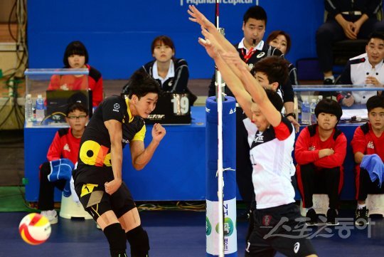 11일 천안 유관순체육관에서 ‘2016-2017 NH농협 V리그’ 현대캐피탈과 OK저축은행의 경기가 열렸다. 1세트 OK저축은행 송명근의 스파이크 공격이 현대캐피탈 블로커의 수비에 막히고 있다.