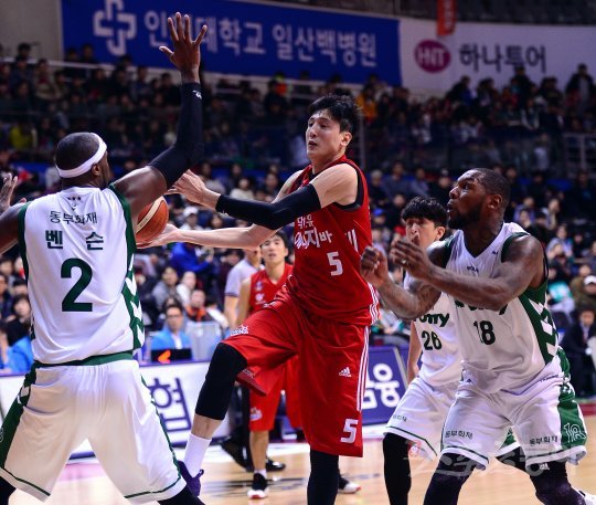11일 고양실내체육관에서 열린 ‘2016~2017 KCC 프로농구’ 고양오리온과 원주동부 경기에서 오리온 최진수가 동부의 수비를 뚫고 골밑 패스를 하고 있다.
