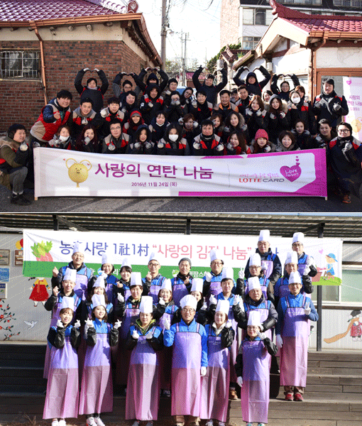 롯데카드 회원 및 임직원들이 ‘사랑의 연탄 나눔’ 봉사활동 후 기념 촬영을 하고 있다(위). 우리카드 임직원들의 ‘사랑의 김장나눔’ 행사. 사진제공 | 롯데카드·우리카드
