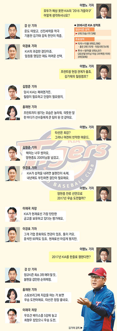 스포츠동아는 KBO리그 10개 구단의 2016시즌을 되돌아보고, 2017년과 그 이후를 전망하는 시리즈 ‘LIVE톡 진단&전망’을 연재한다. 지금까지 선보였던 기사형식과는 전혀 다른 파격적인 구성으로 스포츠동아 야구담당 기자들이 인터넷 채팅을 통한 자유로운 발언으로 토해낸 내용을 편집 없이 날 것 그대로 담았다. 5회는 KIA 담당 이명노 기자가 이재국(차장), 김영준·이경호·홍재현·강산·고봉준 기자를 대화창에 초청했다.
