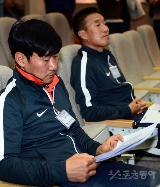 12일 경기도 파주 국가대표트레이닝센터(NFC)에서 ‘2016-2017’ P급 지도자 강습회‘가 개최됐다. 제주 조성환 코치가 강의 내용을 바라보고 있다.