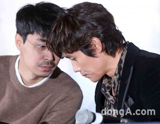감독 조의석(왼쪽)과 배우 이병헌이 12일 오후 서울 성동구 왕십리 한 멀티플렉스에서 열린 영화 '마스터' 언론사사회에서 대화를 나누고 있다.