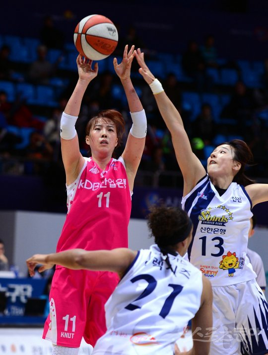 12일 인천 도원체육관에서 열린 ‘삼성생명 2016-2017 여자프로농구’ 인천 신한은행과 구리 KDB생명의 경기에서 KDB생명 조은주가 신한은행 김단비의 수비를 피해 슛을 쏘고 있다.