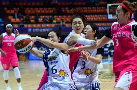 12일 인천 도원체육관에서 열린 ‘삼성생명 2016-2017 여자프로농구’ 인천 신한은행과 구리 KDB생명의 경기에서 신한은행 김아름과 KDB생명 한채진이 리바운드를 다투고 있다.