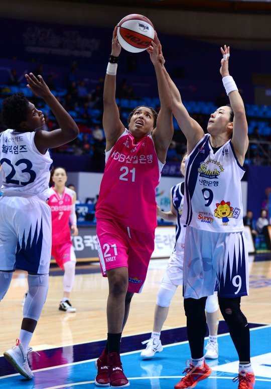 12일 인천 도원체육관에서 열린 ‘삼성생명 2016-2017 여자프로농구’ 인천 신한은행과 구리 KDB생명의 경기에서 KDB생명 하킨스와 신한은행 곽주영이 리바운드를 다투고 있다.