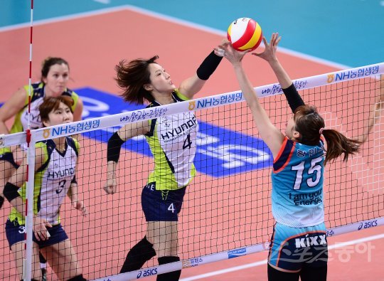 13일 서울 장충체육관에서 열린 ‘NH농협 2016~2017 V리그’ 여자부 현대건설과 GS칼텍스 경기에서 현대건설 황연주가 밀어넣기 공격을 하고 있다.